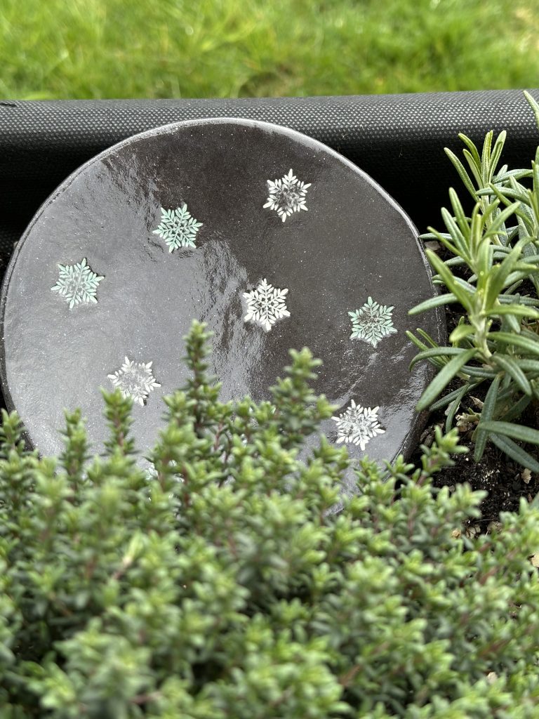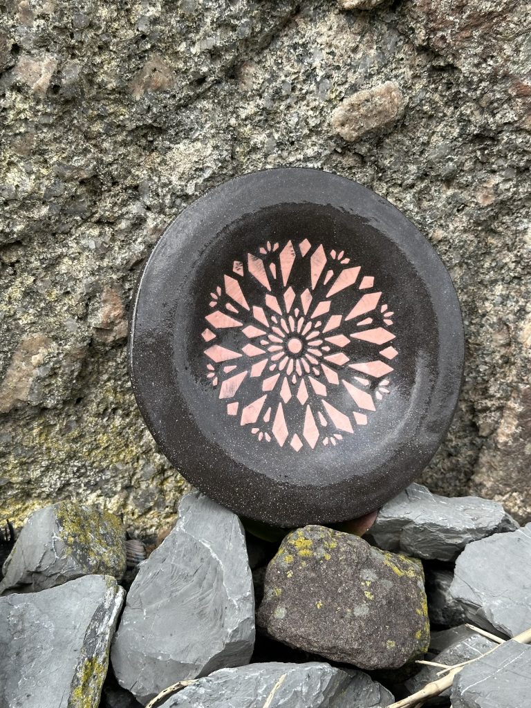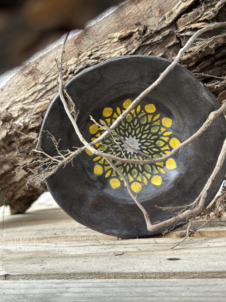 Bedrucke drei-vier kleine Teller aus schwarzem Ton mit dekorativen Motiven. Verschiedene Motive und Farben vorhanden. Der Kurs findet an zwei Nachmittagen