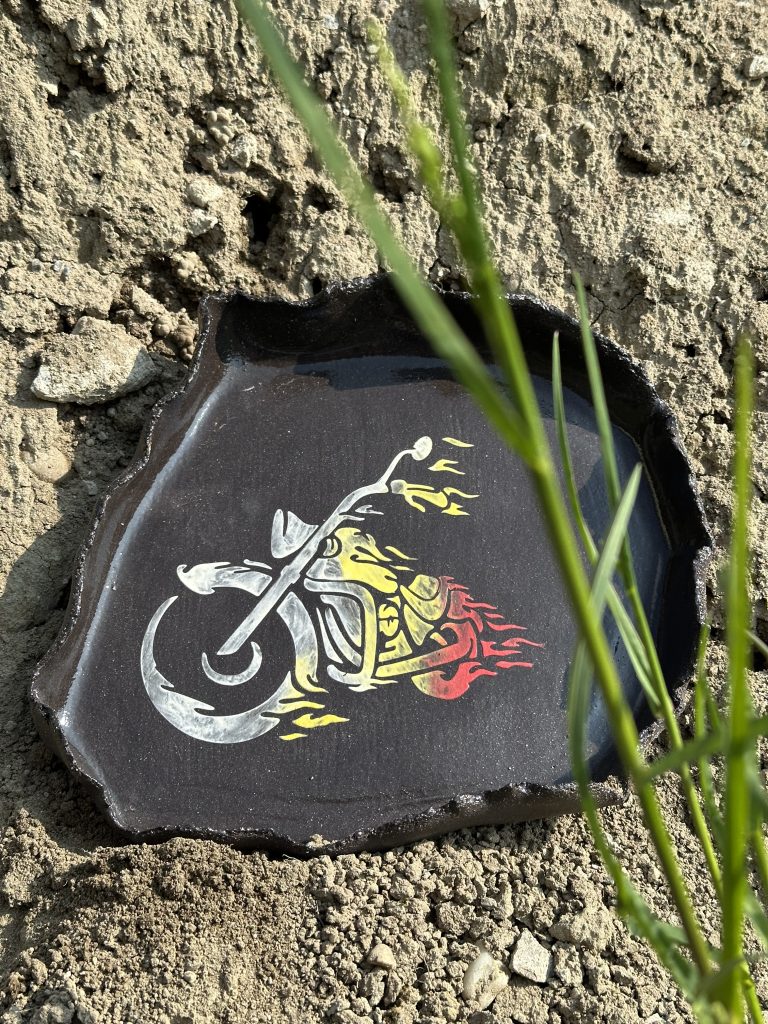 Bedrucke drei-vier kleine Teller aus schwarzem Ton mit dekorativen Motiven. Verschiedene Motive und Farben vorhanden. Der Kurs findet an zwei Morgen