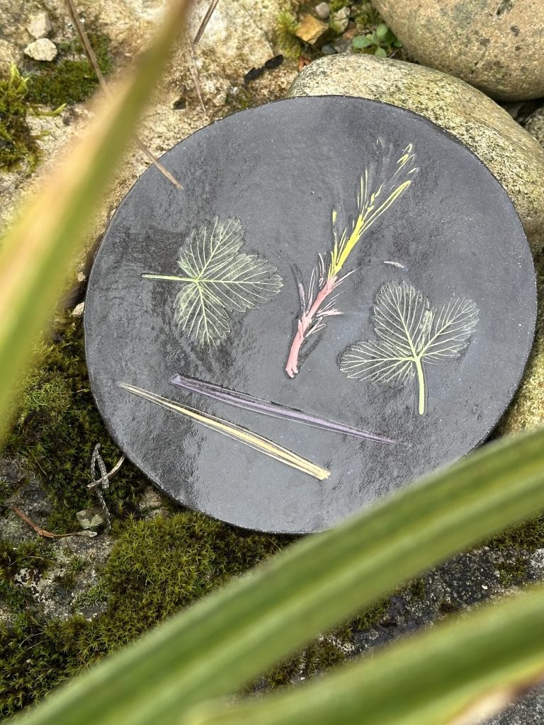 Blätter, Blüten und was du sonst noch findest, geben wunderschöne Abdrücke in deine drei-vier Tonobjekte aus schwarzem Ton. Der Kurs findet